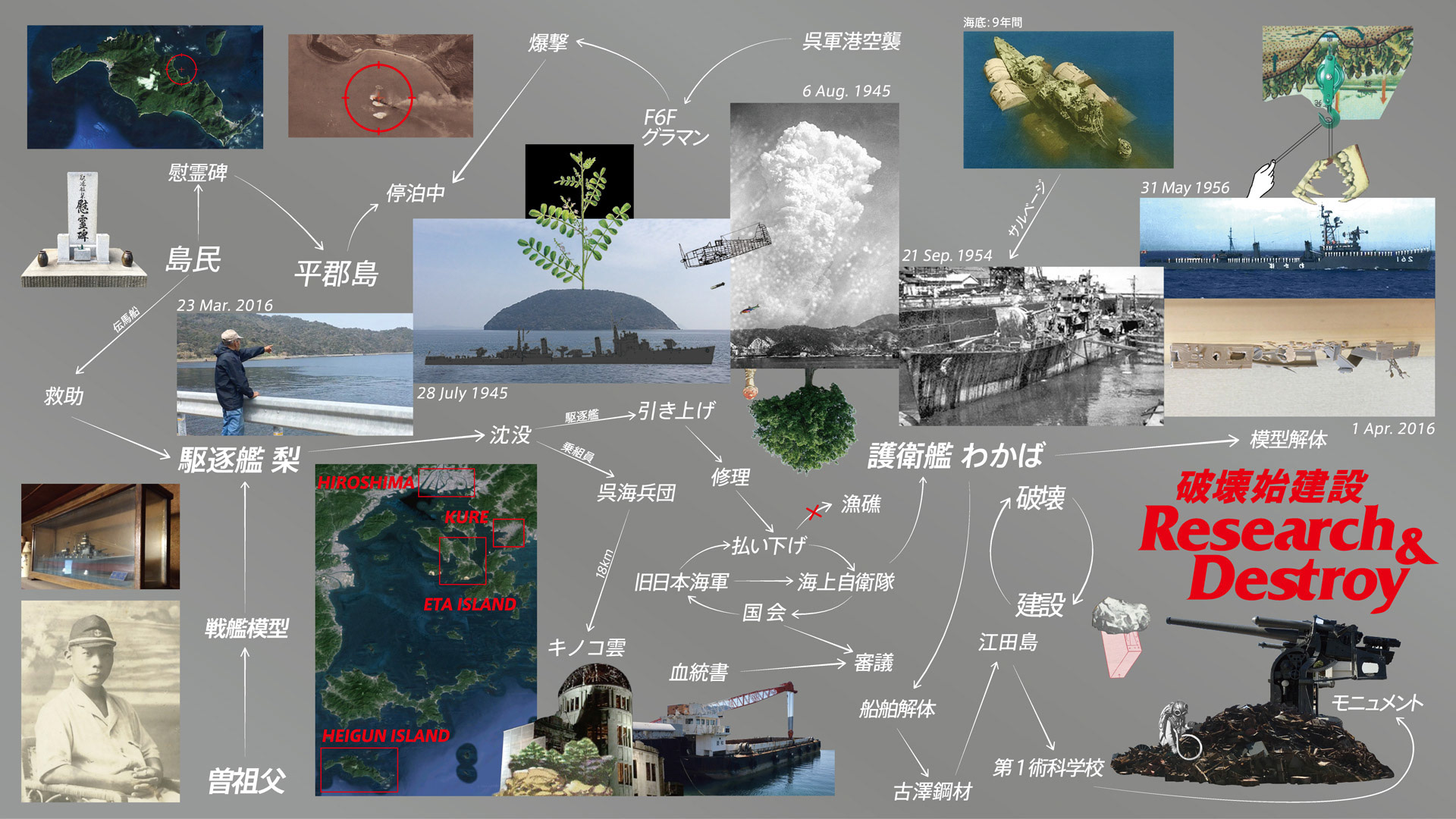 この展示は,歴史的な題材への入念な調査にもとづき,廃品を利用したオブジェ,模型,ドキュメント映像,写真,ダイアグラムなど,調査の過程で見出された事実や出来事から派生するさまざまな作品によって構成されています.新作である,曾祖父が日本海軍の駆逐艦の乗員だったことを発端に,その軍艦が戦後,海上自衛隊の護衛艦として再生したという事実にまつわる戦後の兵器の解体史を,証言とともに映像作品にし,それをもとに,その背後にある隠された連関を導き出します.